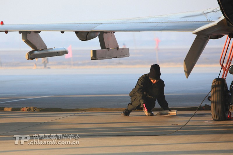 2013年1月6日,空軍華北機(jī)場某航空兵師在這一天新年首飛。在進(jìn)行了兩天的充分準(zhǔn)備之后,機(jī)務(wù)人員在早晨6點(diǎn)30分就準(zhǔn)時(shí)來到外場。上午9點(diǎn)整,數(shù)架殲十戰(zhàn)機(jī)準(zhǔn)時(shí)升空,開始了一天的訓(xùn)練。記者在外場有幸記錄下這冬日陽光里精彩的飛行場景。(來源:中國軍網(wǎng) 苑小偉攝影報(bào)道)