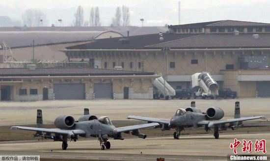 當(dāng)?shù)貢r(shí)間4月2日,位于韓國(guó)首爾以南的烏山空軍基地內(nèi),駐韓美軍戰(zhàn)機(jī)頻繁進(jìn)行起降訓(xùn)練。圖為停放在機(jī)場(chǎng)上的美軍A-10攻擊機(jī)。