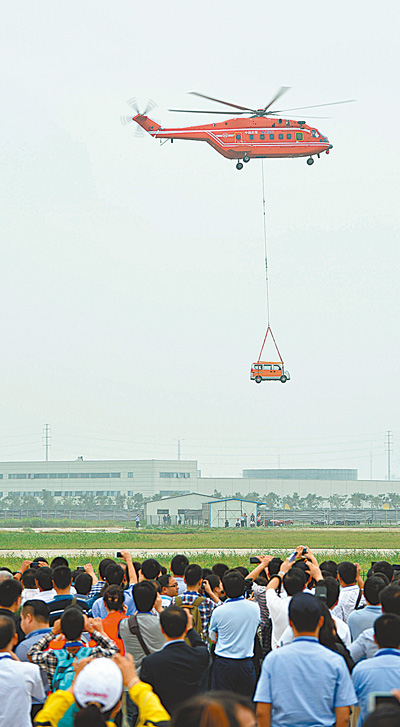 5日,開幕式上,飛行員駕駛13噸重的AC313直升機(jī),模擬將交通事故中受損的車輛吊離現(xiàn)場。