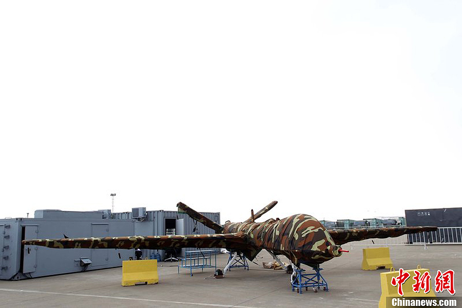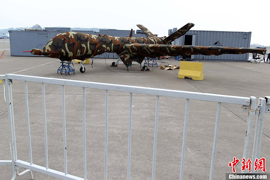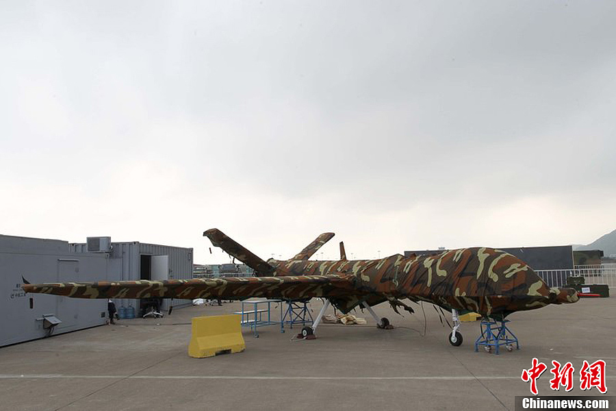 曾在前兩屆珠海航展上展出模型的翼龍無人機,在今年航展上以實物參展。11月8日,該機已經(jīng)組裝完畢停放在展坪上。該款無人機由中航工業(yè)旗下成都飛機設(shè)計研究所研制,該機裝有一臺100馬力活塞發(fā)動機,具備全自主平輪式起降和飛行能力,最大起飛重量達(dá)1100公斤,最大續(xù)航時間為20個小時,可攜帶各種偵察、激光照射/測距、電子對抗設(shè)備及小型空地打擊武器,可執(zhí)行監(jiān)視、偵查及對地攻擊任務(wù)等任務(wù),也可用于維穩(wěn)、反恐、邊界巡邏等。
