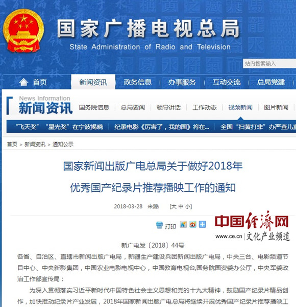 廣電總局:做好2018年優(yōu)秀國產(chǎn)紀(jì)錄片推薦播映工作