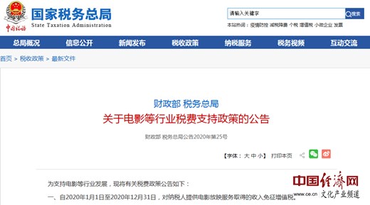 經(jīng)濟日報-中國經(jīng)濟網(wǎng)北京5月20日訊 近日,國家稅務(wù)總局官網(wǎng)發(fā)布《關(guān)于電影等行業(yè)稅費支持政策的公告》(以下簡稱《公告》),支持電影等行業(yè)發(fā)展。