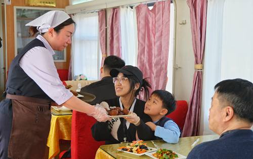 春運首日鐵路天津客運段值乘的T253次列車上餐車服務人員正在為旅客提供用餐服務。(楊寶森/攝)