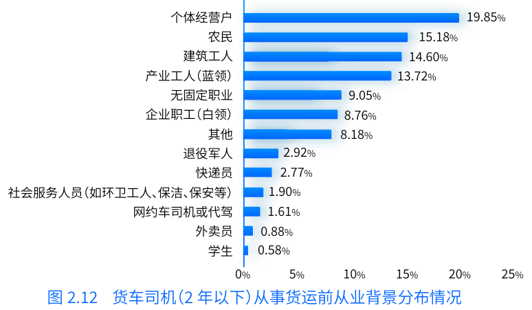不僅如此,報告中還提到,過往貨運行業(yè)對傳統(tǒng)行業(yè)從業(yè)者的吸引力較強,多為農(nóng)民、個體經(jīng)營戶、產(chǎn)業(yè)工人(藍(lán)領(lǐng))、無固定職業(yè)、建筑工人等群體。而近幾年,轉(zhuǎn)型從事貨車司機的職業(yè)還包含了企業(yè)職工(白領(lǐng))、社會服務(wù)人員、學(xué)生等,另外,外賣員、快遞員、網(wǎng)約車司機及代駕司機等新型靈活就業(yè)者也有部分人群選擇轉(zhuǎn)行成為貨車司機。