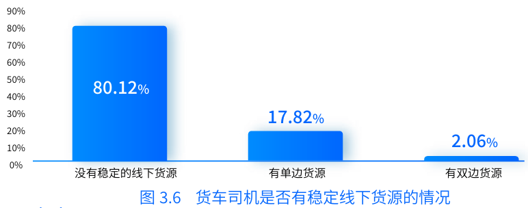 報告中提到,約80.12%的司機沒有穩(wěn)定的線下貨源供應(yīng),貨車司機很少能夠掌握穩(wěn)定線下貨源。大部分司機面臨貨運工作的不穩(wěn)定性,需要花費大量時間和精力去尋找和獲取貨源,這不僅降低了他們的運輸效率,也增加了運營成本。