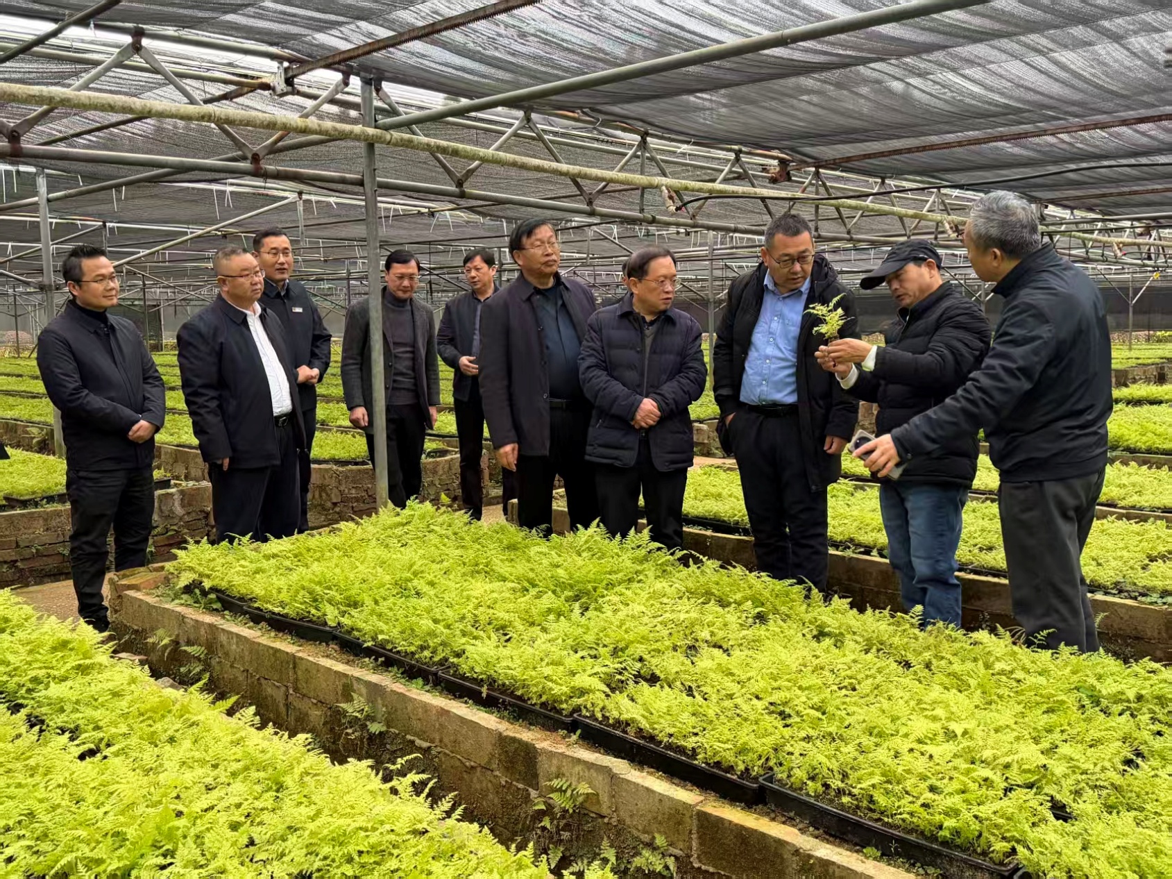 圖為陳幸良(右二)在廣西融水觀察林下作物金毛狗脊育苗情況。(受訪者供圖)