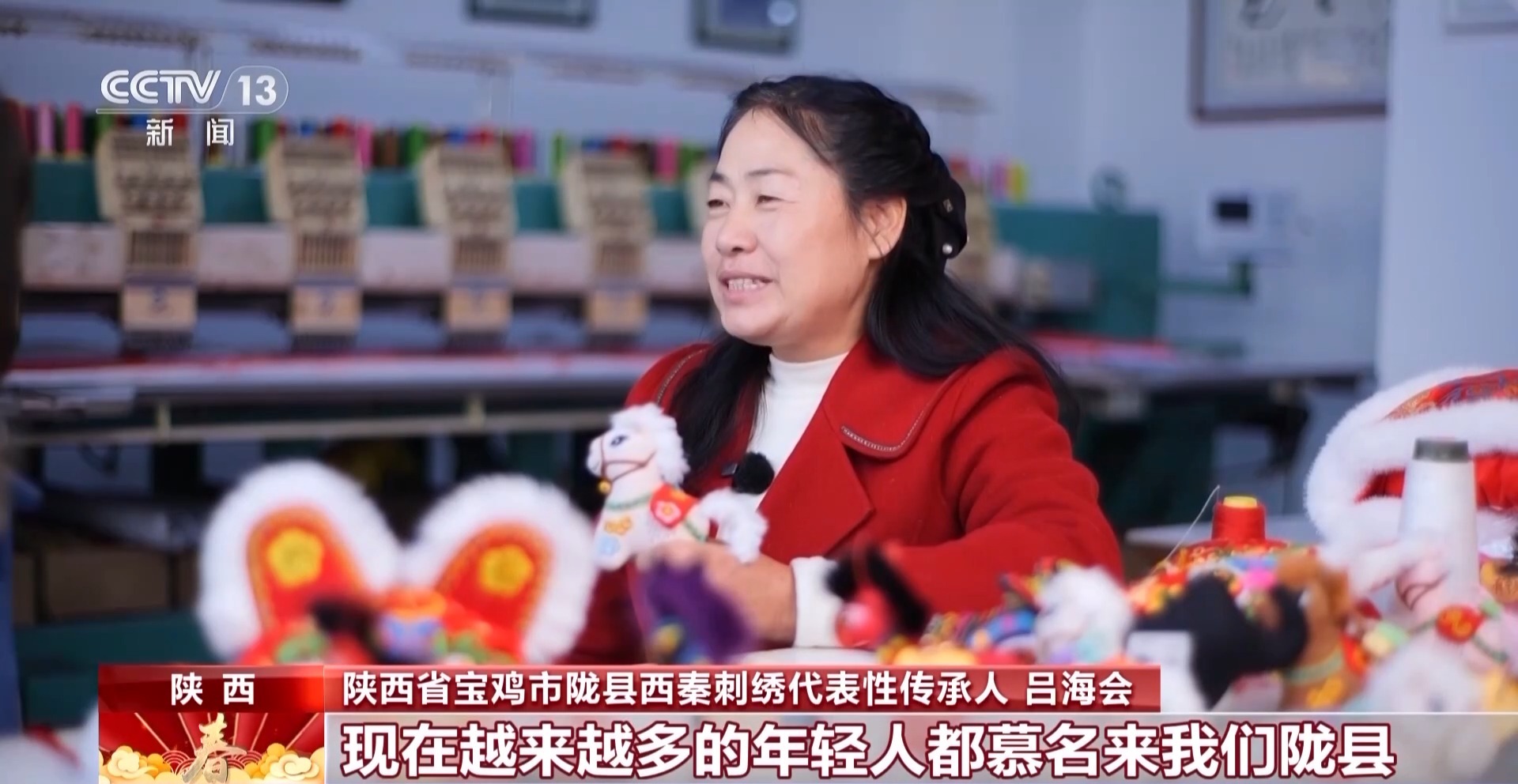 陜西省寶雞市隴縣西秦刺繡代表性傳承人 呂海會(huì):現(xiàn)在越來(lái)越多年輕人都慕名來(lái)我們隴縣看馬社火,也讓更多的人了解到西秦刺繡、喜歡西秦刺繡。我們?cè)诩议T口傳播手工布藝的同時(shí),也讓大家得到一份收入,心里非常開心。