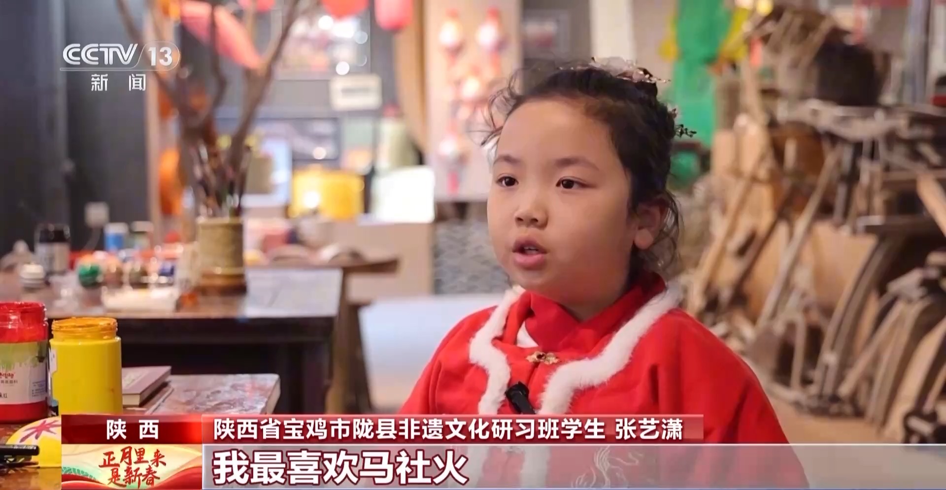陜西省寶雞市隴縣非遺文化研習(xí)班學(xué)生 張藝瀟:我最喜歡馬社火,因?yàn)榉浅M洌医裉爝€畫了社火臉譜。