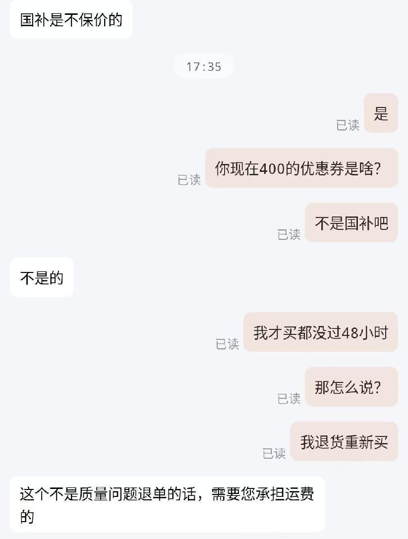 面對這突如其來的降價,李先生深感憤怒與無奈。他嘗試通過平臺客服協調退還差價,但得到的答復卻是:由于產品享受了政府補貼,差價不予退還。李先生氣憤地表示:“有種被當傻子耍的感覺。”經過多次溝通,李先生最終與客服協商達成了無條件退貨的協議,退貨運費由平臺承擔。隨后,李先生又用家人的賬號領取政府補貼后,加上新的活動優(yōu)惠,以低于原購買價500元的價格于同一網購平臺再次購買了同一款空氣凈化器。