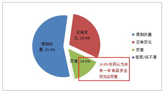 總體來(lái)說(shuō),市民對(duì)未來(lái)食品安全的改善比較有信心。55.5%的市民認(rèn)為未來(lái)一年的食品安全會(huì)得到改善,14.6%的市民認(rèn)為會(huì)變差,還有29.9%的市民認(rèn)為會(huì)沒(méi)有變化。