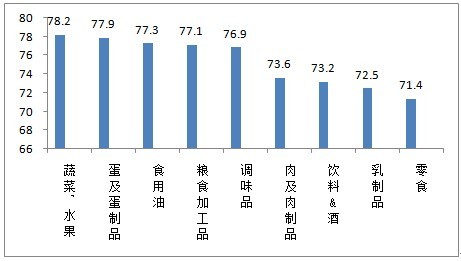 從未來(lái)發(fā)展趨勢(shì)來(lái)看,市民對(duì)蔬菜、水果的信心評(píng)價(jià)指數(shù)最高為78.2,其次是蛋及蛋制品為77.9,未來(lái)信心偏低的依然是零食、乳制品、飲料&酒和肉及肉制品。