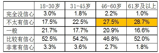 就未來一年食品安全狀況改善的信心來看,46歲以上年齡較大的市民對未來改善的信心不足。