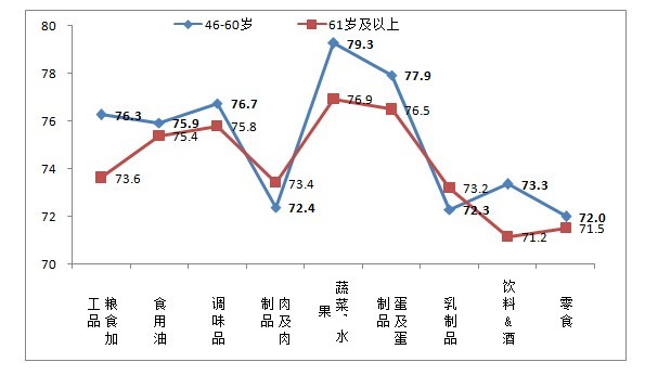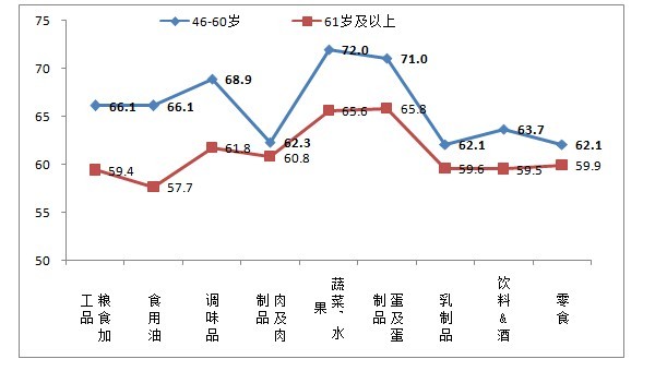 進(jìn)一步分析46歲以上市民對食品安全現(xiàn)狀擔(dān)憂的食品領(lǐng)域,46-60歲市民對肉及肉制品、乳制品、飲料&酒和零食的安全信心指數(shù)評價(jià)較低,直接拉低他們目前對食品安全的放心程度。61歲以上市民目前對九大類食品的安全信心指數(shù)都偏低,除蔬菜水果和蛋及蛋制品外,其它食品的信心指數(shù)都低于65。