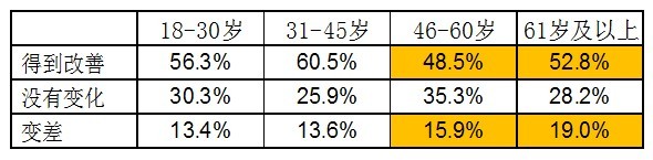 解讀一:過去一年,46-60歲的市民對食品安全狀況的改善評價(jià)較低