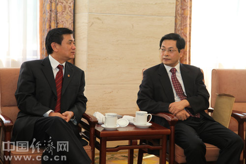 由中國道路交通安全協(xié)會、中國汽車技術(shù)研究中心和中國經(jīng)濟網(wǎng)共同主辦的“2013中國道路交通安全論壇”于8月29日在北京首都大酒店舉行。圖為交通運輸部副部長馮正霖(左)與安監(jiān)總局副局長孫華山進行交流。中國經(jīng)濟網(wǎng) 裴小閣 攝影