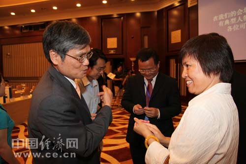 2013年全國(guó)食品安全宣傳周啟動(dòng)儀式暨第五屆中國(guó)食品安全論壇6月17日在北京舉辦,今年主題為“社會(huì)共治 同心攜手維護(hù)食品安全”。圖為康師傅中央研究所所長(zhǎng)楊乾輝與中國(guó)飲料工業(yè)協(xié)會(huì)理事長(zhǎng)趙亞利進(jìn)行交流。 中國(guó)經(jīng)濟(jì)網(wǎng) 郝紅波/攝