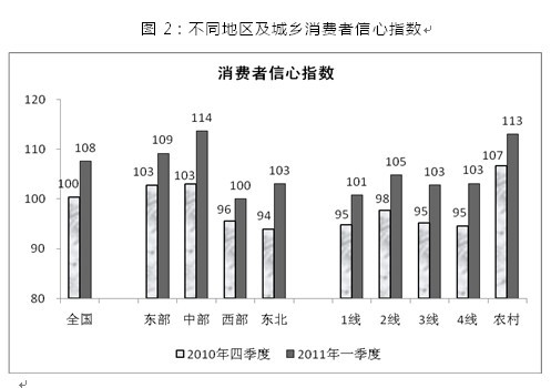 2011年一季度中國消費者信心指數為108,比2010年四季度大幅上升8點,接近近兩年高點。消費者對當前經濟形勢的滿意度和對未來經濟走勢的預期樂觀度均明顯上升,持樂觀態(tài)度的消費者比重均接近兩年內的最高點。